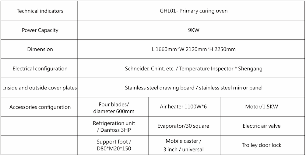 The basic principle of the primary curing oven is the use of electricity as a thermal energy source,the compressor group as a cooling source,heat generated by the electric heating element,convection heat transfer using a fan,heat transfer of the material,and continuous replenishment of fresh air and discharge of humid air.Its biggest feature is that it can control the temperature increase and decrease according to different product requirements.